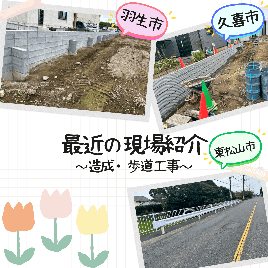 さて、今日は羽生市・久喜市の造成工事と東松山市の歩道工事の写真をアップしましたぜひ見てください